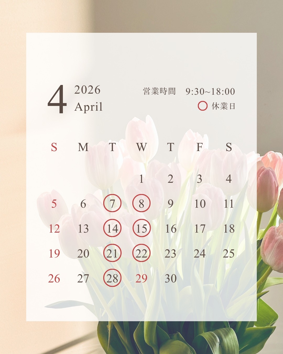 < 4月> 定休日のお知らせ